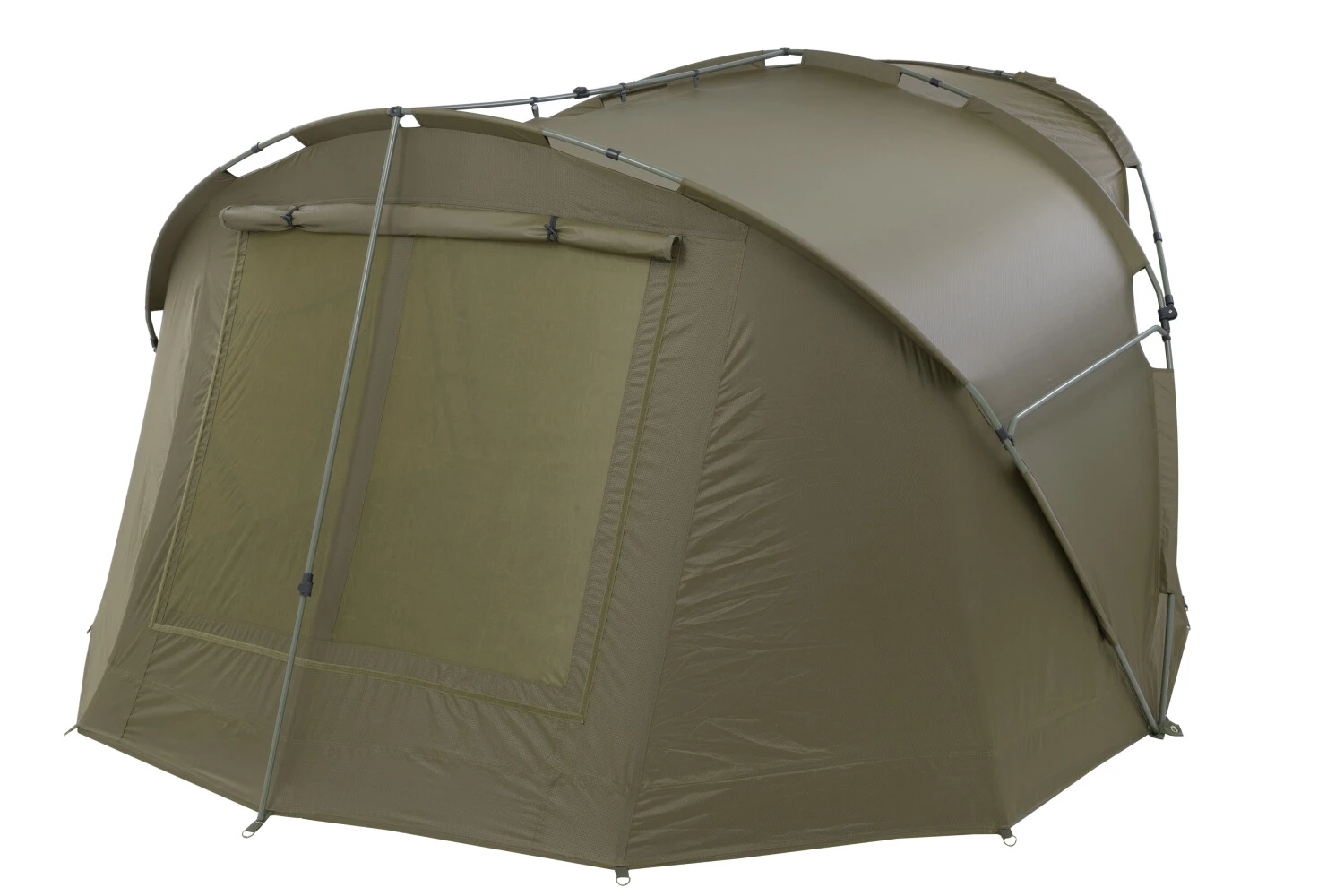Predný ochranný šilt v kombinácii s rozpernými tyčkami dokáže vystužiť celý bivak na maximum. Práve nové zámky v rozperných tyčiach poskytujú silu a tuhosť aj vo veternom počasí. Vysokú stabilitu vytvárajú aj špeciálne tvarované bočné rozperné tyčky, ktoré presne zapasujú na svoje miesto a držia tvar celého bivaku. Súčasťou bivaku sú aj pevné kovové kolíky a predný priehľadný panel na predné dvere.