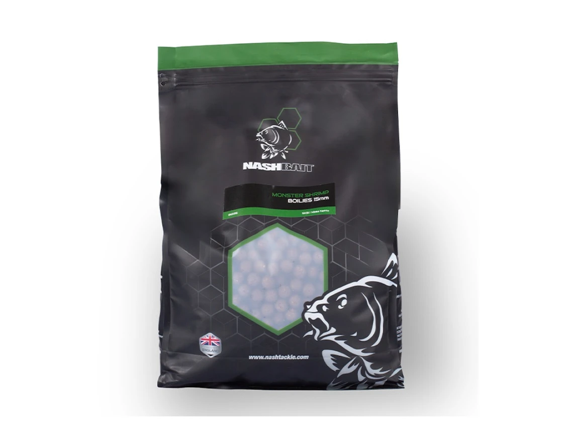 Nástrahy značky Nash patria určite k špičke pri love kaprov. Iné sa nedá povedať ani o Boilies Monster Shrimp, ktoré je vyrobené na jedinečnej prírodnej báze. Či už chytáte dlhé výpravy alebo kratšie vychádzky, tak ryby budú vždy s dôverou prijímať toto boilies. Jedná sa unikátnu potravovú formulu značky Nash kombinujúcu obohatené a upravené rybie múčky, unikátne doplnky Nash Monster a mixom morských ingrediencií krabích múčok a extraktov, olej z komára a neskutočne účinnú slanú pastu z kreviet.