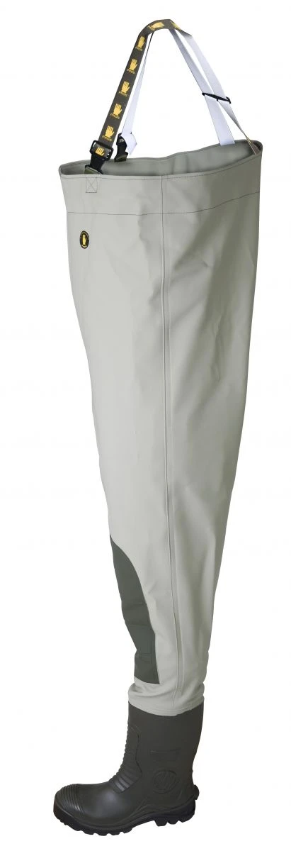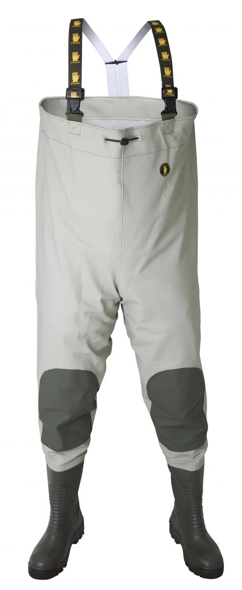 Brodiace čižmy značky PROS, ktorá patrí medzi najväčších výrobcov nepremokavej obuvi v Európe. Čižmy sú vyrobené z originálneho materiálu PLAVITEX s hrúbkou 0,7mm (zosilnený PVC/Polyester) 700g/m2. PLAVITEX je extrémne odolná technická tkanina odolná voči mechanickému poškodeniu, ktorá je doplnená dvojitými podlepenými švami zabezpečujúcimi dokonalú odolnosť proti pretečeniu. Exkluzívnosť týchto čižiem dotvárajú kolenné výstuže, ktoré znižujú riziko predratia ako aj kvalitné boty 400P s pevnou čiernou podrážkou. Samozrejmosťou sú elastické traky s rýchloprackami, sťahovacia šnúrka na hrudi, vnútorné vrecko a taktiež certifikát produktu spĺňajúci požiadavky Európskej normy EN343 o vodeodolnosti.