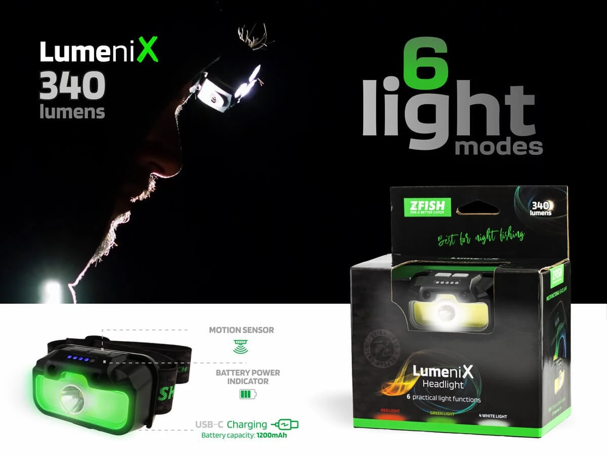 Lumenix je praktická a výkonná čelovka, ktorá ponúka vysoký svetelný výkon s možnosťou nastavenia intenzity a uhla svietenia, vďaka čomu si ľahko prispôsobíš osvetlenie podľa potreby. Je vybavená viacerými režimami svietenia, vrátane červeného svetla, ktoré nenarušuje nočné videnie a nevyplaší ryby.