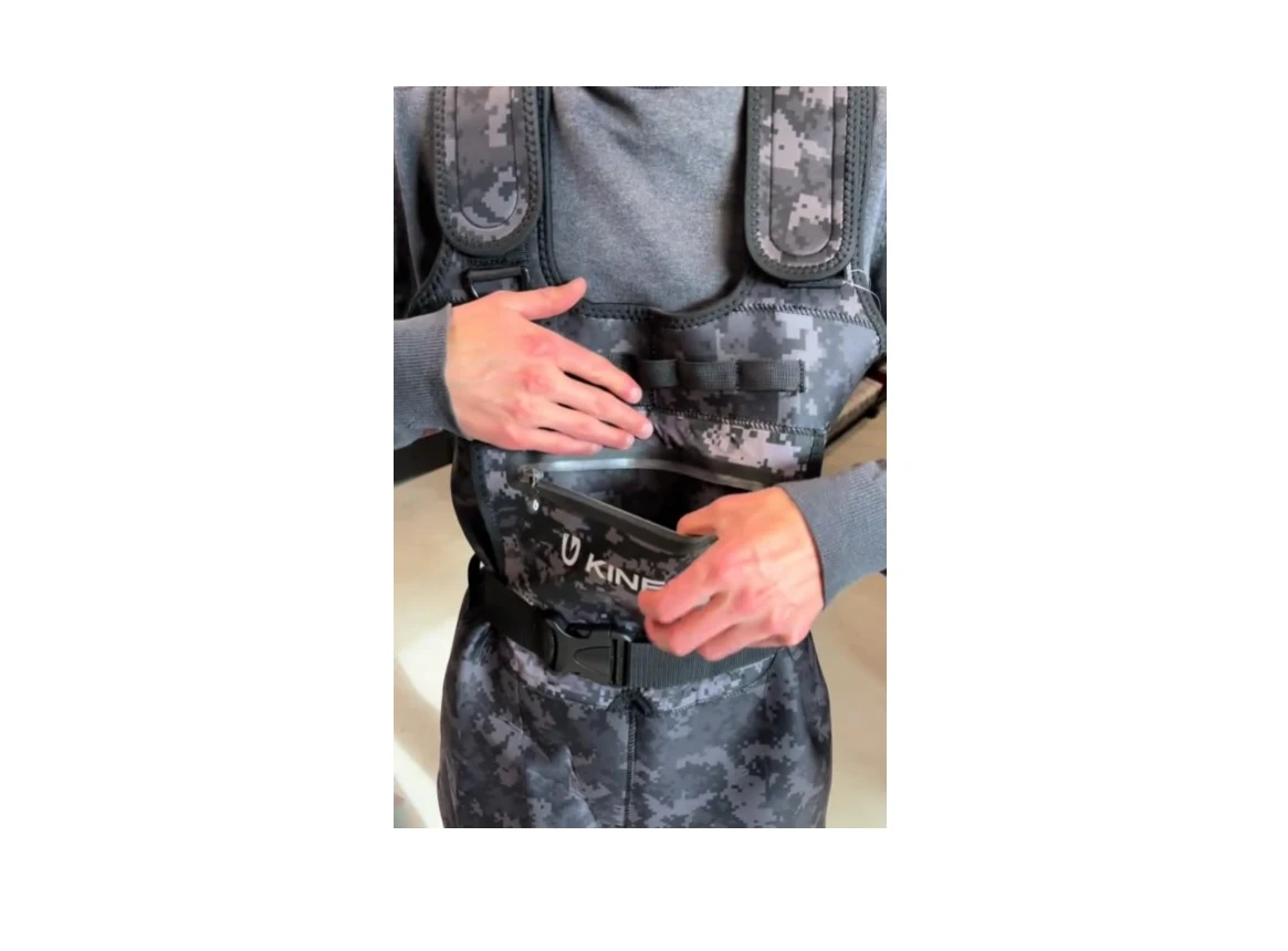 Čižmy brodiace Neorush Bootfoot Felt sú vyrobené z odolného 4.5mm SCR hrubého neoprénu pričom sa vynikajúco prispôsobnujú tvaru tela čo výrazne uľahčuje pohyb. Takto máte dostatok pružnosti nie len pri samotnom brodení, ale aj pri švihaní prútom. Kvalitný materiál dostal zaujímavý camo dizajn pre splynutie s prírodou. Všetky švy boli dodatočne ešte podlepené čo zaručuje 100% vodotesnosť. Veľmi chválime praktické predné vrecko na zips a taktiež priechodné predné vrecko. Kvalitný hrubý suchý zips na trakoch vám presne vyladí výšku prsačiek do maximálneho komfortu. Nesmie chýbať ani remeň na páse.