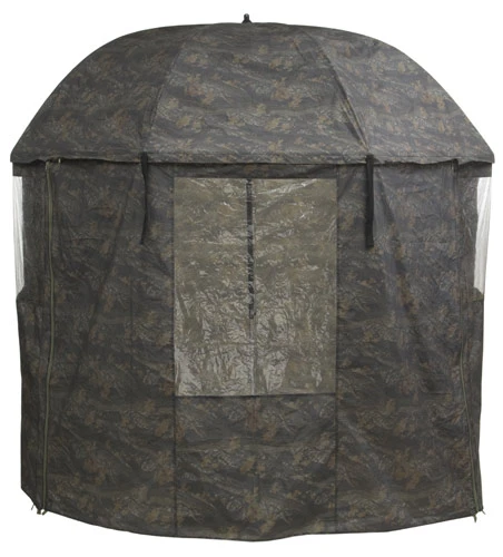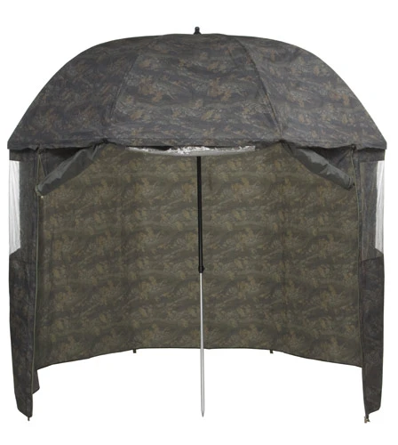 Nový typ dáždnika s bočnicami a odnímateľným krytím prednej časti. Je vybavený jedným predným a dvomi bočnými oknami. Osvedčený kvalitný dáždnik s kĺbom a bočnicami prepracovaný do najmenších detailov s priemerom 2,5m (cez kopulu). Je vybavený silnostennou stredovou tyčou, odolnou voči deformácii. Poťah je vyrobený z ľahkého, avšak 100% nepriepustného „pogumovaného“ materiálu v zaujímavej maskáčovej úprave s lepenými švami, ktoré tak neprepustia ani kvapku vody! Zosilnené stredové tyčky vytvárajú ideálny kopulovitý tvar čo pomáha správnemu odtekaniu vody pri daždi. Bočnica je taktiež vyrobená z pogumovaného materiálu a je pripnutá pomocou silného zipsu, ktorý je prekrytý pásom vodeodolného materiálu aby nedošlo k pretečeniu. Upozornenie: Pri silnom vetre odopnite bočnicu, nakoľko môže prísť k jej poškodeniu alebo roztrhnutiu!