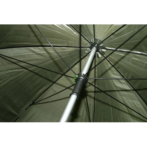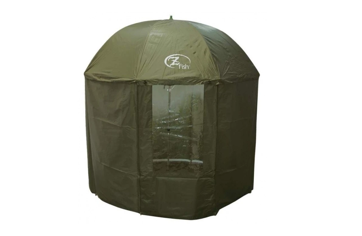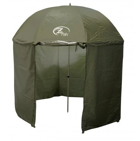 Celouzatvárací dáždnik českej rybárskej značky Zfish, ktorý hneď na prvý pohľad zaujme kvalitným materiálom v zelenej farbe. Samotný materiál je navyše jemne pogumovaný z vnútornej strany čím dosahuje paramatre vodeodolnosti na úrovni 3000mm. Samozrejmosťou sú podlepené švy a chrániaci lem nad zipsom bočnice, ktorý zamedzuje pretečeniu. Celú bočnicu je možné odzipsovať a používať tak dáždnik samostatne. Predný vstup môžete vyrolovať a mať tak voľný vstup. Pri kompletnom zakrytí je v prednej časti priehľaná časť aby ste mali prehlad čo sa deje. Pre zvýšenie stability sú súčasťou balenia aj napichovacie kolíky a šnúrky.