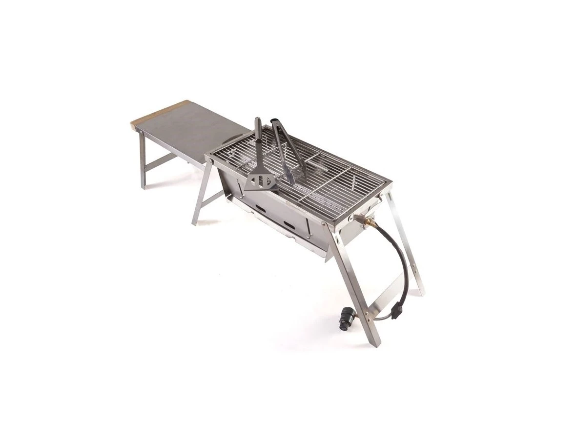Doprajte si čerstvé, chutné a lahodné jedlo aj na svojich kaprárskych výpravách! Anglický špecialista v oblasti prvotriednych kaprárskych produktov značka Ridgemonkey predstavuje prvotriedny gril, ktorý bol premyslený špeciálne pre potreby nadšených kaprárov. Mimoriadne skladná konštrukcia, ktorú je možné rozložiť doslova v sekunde umožňuje výborné transportné rozmery a tak vám gril nebude zaberať takmer žiadny priestor. Mimoriadne kvalitná nerez a spracovanie do posledného detailu zaručuje prvotriednu kvalitu a spokojnosť rybára. Po celej dĺžke grilu je umiestnená plynová lišta teda horák, ktorý ľahko prepojíte napráklad s kartušou na závit EN417. Zapínanie plameňa sa realizuje veľmi jednoducho pomocou piezo tlačidla. Gril je možné používať aj s briketami, na ktoré je vytvorené "brucho" v strednej časti grilu. Ku grilu odporúčame ešte dokúpiť platňu Grilla BBQ Hotplate, ktorá v sebe zachytí prebytočný tuk a šťavu z pripravovaného jedla a tak vám tieto šťavy nebudú kvapkať po grile. Rozmery grilovacej plochy sú 40x20cm čo je dostatok miesta pre prípravu jedla ako pre vás tak aj pre kolegov rybárov či rodinu. V balení ku grilu je aj prídavný stolík, kam si môžete odložiť kuchárske pomôcky či taniere. V balení je aj prepravný obal.