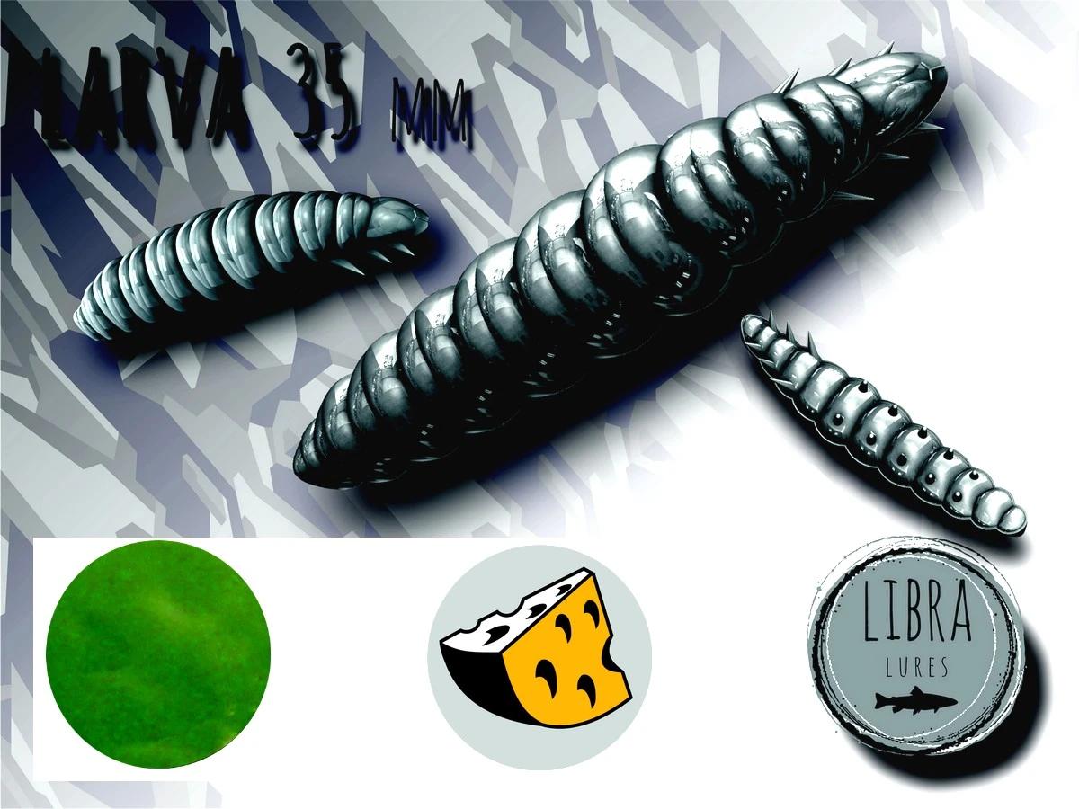 Absolútne unikátna nástraha, ktorú by mal vyskúšať každý prívlačiar. Značka Libra Lures vyrába špičkové prívlačové nástrahy, ktoré vyvíjali dlhé mesiace a ktoré vznikli skenovaním živých organizmov čím sa podarilo dosiahnuť absolútne unikátne tvary. Larva je dokonalou napodobneninou skutočnej larvy hmyzu, ktorá patrí k najčastejšiemu zdroju prirodzenej potravy pre ryby ako sú pstruhy, jalce, ostrieže, bolene a iné ryby. Práve jedinečný tvar spôsobuje výborný chod vo vode, kde nemusíte vydávať žiadne prudké pohyby, ale nástraha často pracuje namiesto rybára. Už prvý krát ako uchopíte nástrahu tak pocítite jej jedinečnú mäkkosť, ktorá je pre ryby dôveryhodná a preto sa atakujúca ryba vráti aj ďalší krát po neúspešnom ataku. Ďalším výrazným lákadlom je syrová aróma, ktorá je stále poriadne cítiť aj po niekoľko hodinovom love a tak stále vydáva lákavú stopu. Nástraha je výborná ako na klasický lov tak aj na pretekárske účely.