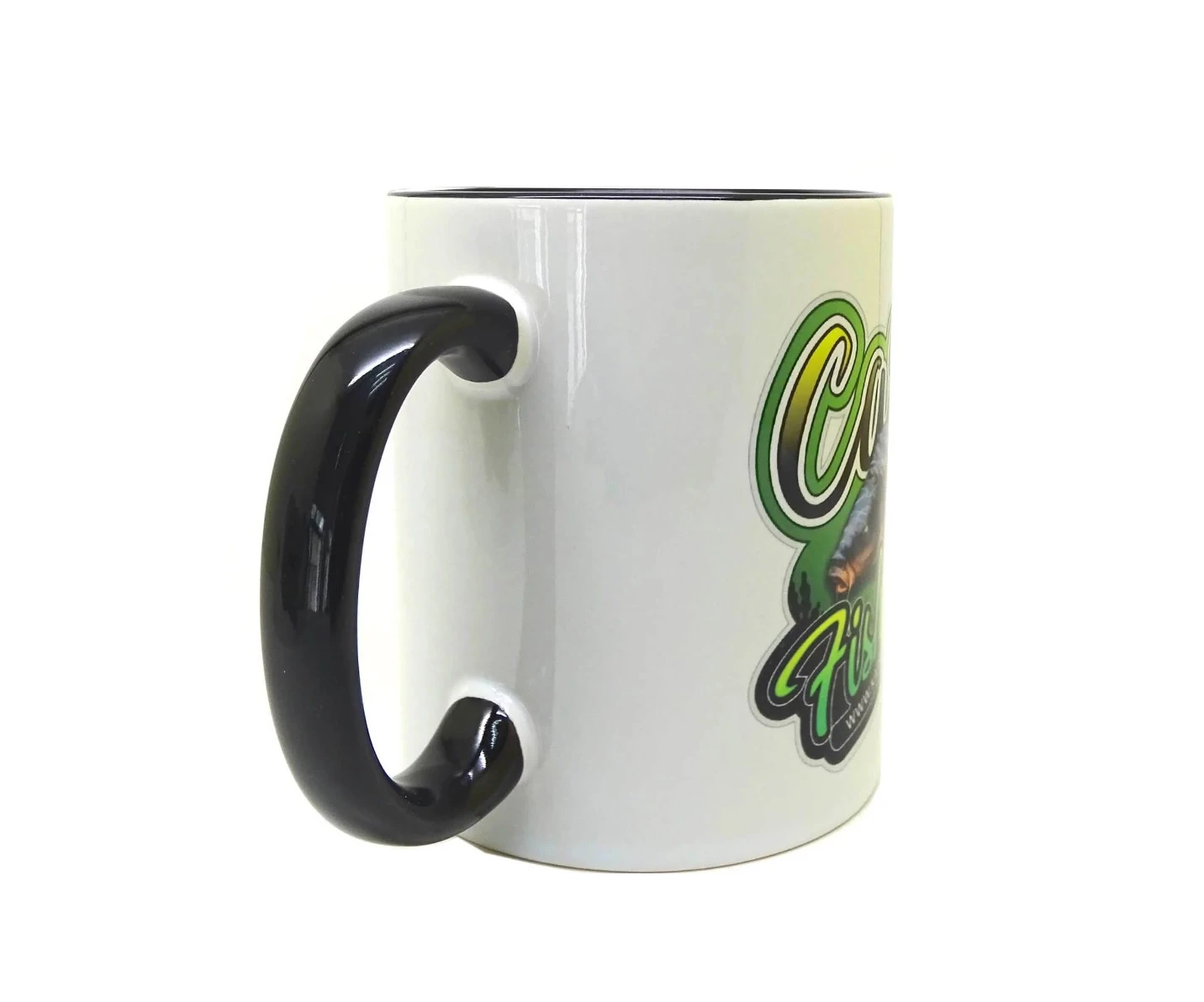 Štýlový keramický hrnček značky Katran, ktorý je v štýlovej bielej farbe s čiernym uškom a má príznačné logo znaku Katran a taktiež obrázok kapra.