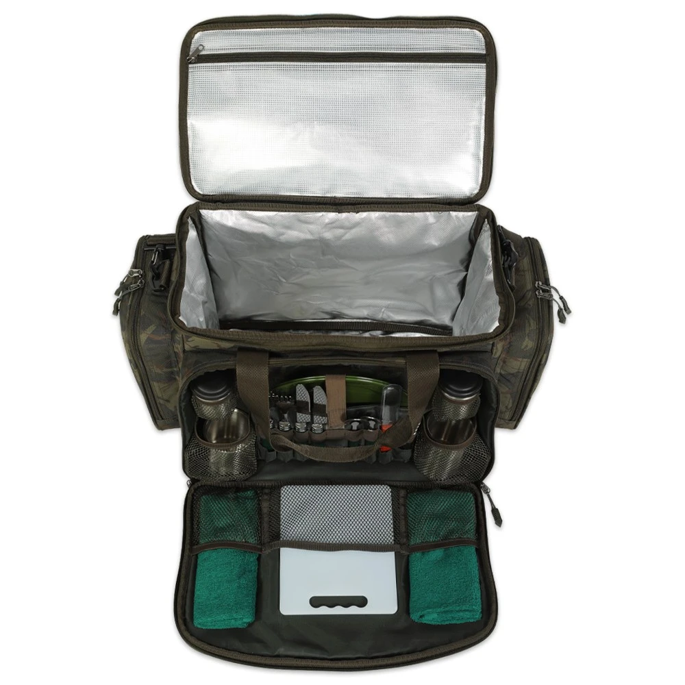 Dlhší pobyt pri vode sa rozhodne nezaobíde bez kvalitných doplnkov na stravovanie. Popri malých rybárskych varičov na plyn, či kempingovom riade netreba zaábať na kvalitný jedálenskú a chladiacu tašku na potraviny či ostatné doplnky pre stravovanie. Jedálenská taška Food Bag Carryall značky Giants fishing spĺňa všetky kritériá pre potreby nadšených rybárov. Taška je označená ako jedálenská pričom hlavný priečinok je zároveň odizolovaný a preto slúži aj ako chladiaci box, kde môžete uschovať svoje potraviny pri cestovaní. Taška má prepracované prevedenie bol použitý kvalitný hrubý materiál s pogumovanou spodnoučasťou takže je možné tašku položiť aj na vlhké podložie. Súčasťou tašky sú 2ks nerezové hrnčeky, 2ks nádoby na soľ či korenie, 2ks taniere, 2ks príbor (lyžica, vidlička, nožík), 1ks nôž na ovocie, 1ks multifunkčný nôž s otvarákom na konzervy, 1ks podložka na krájanie, 2ks uteráky. Exkluzivitu tašky dotvára umývací povrch v camo dizajne a polstrovaný popruh cez rameno. Rozmery sú 50x28x30cm.