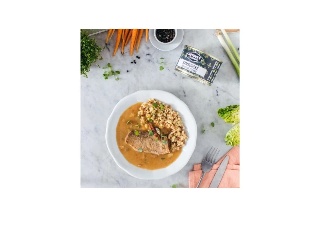 Vynikajúce bravčové mäso na hamburskej (smotanovo zeleninovej s horčicou) omáčke, na ktorom si skutočne pochutíte. Práve Hotovky z plechovky ponúkajú sterilizované hotové jedlo v konzervách, ktoré stačí len zohriať a pochutiť si ako v reštaurácii. Či už ste pri vode a užívate si rybačku alebo kempujete s rodinou a priateľmi, tak stačí len zohriať konzervu a dosýta sa najesť. Balenie 400g postačuje pre jedného rybára na plnohodnotné jedlo. Všetky jedlá sú slovenskej výroby pričom spĺńajú všetky potravinárske štandardy a sú zarukou vysokej kvality.