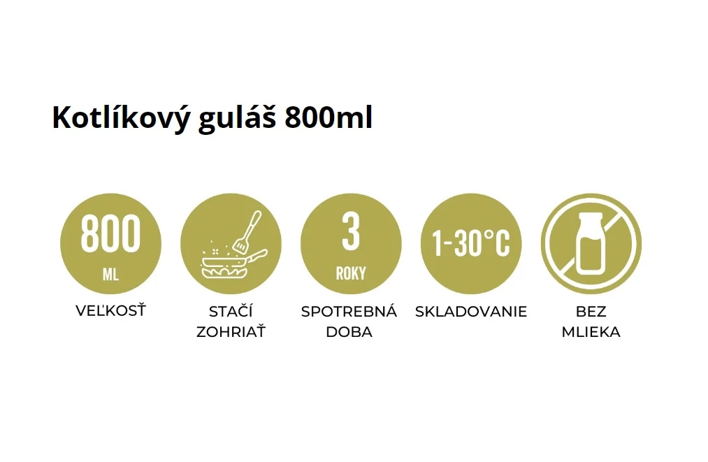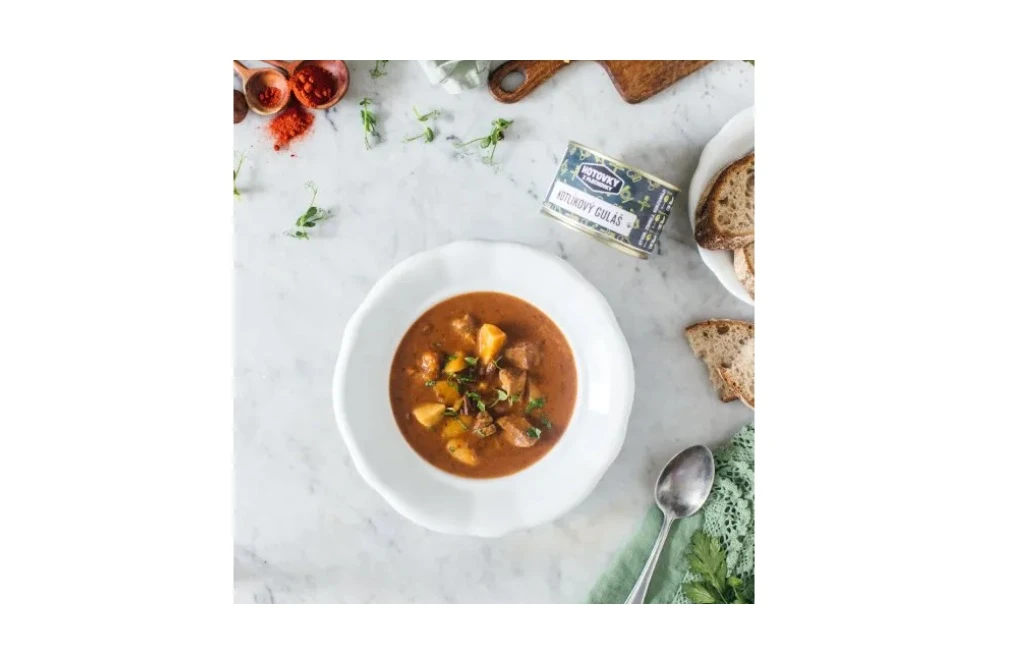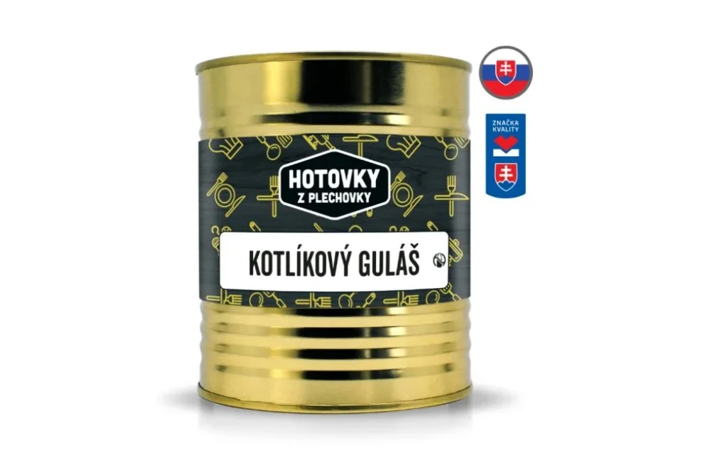 Vynikajúci kotlíkový guláš s bravčovým mäsom, na ktorom si skutočne pochutíte. Práve Hotovky z plechovky ponúkajú sterilizované hotové jedlo v konzervách, ktoré stačí len zohriať a pochutiť si ako v reštaurácii. Či už ste pri vode a užívate si rybačku alebo kempujete s rodinou a priateľmi, tak stačí len zohriať konzervu a dosýta sa najesť. Balenie 400ml je určené pre bohatý obed pre jednu osobu, 800ml postačuje pre dvoch ľudí na plnohodnotné jedlo. Všetky jedlá sú slovenskej výroby pričom spĺńajú všetky potravinárske štandardy a sú zarukou vysokej kvality.