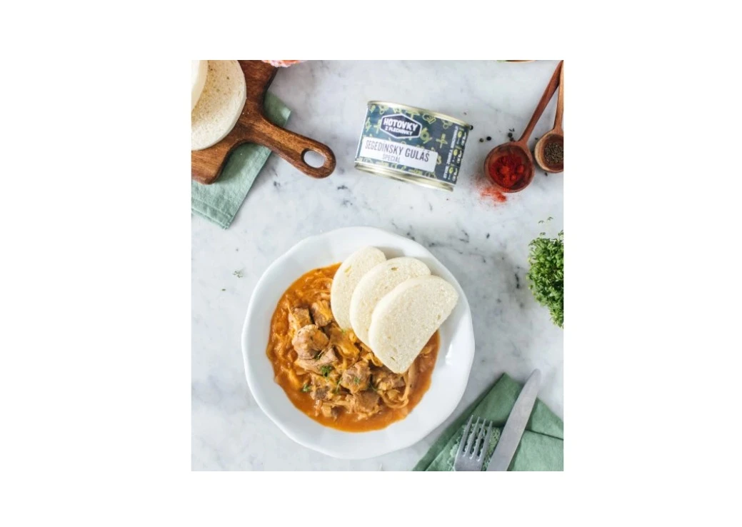 Vynikajúci segedínsky guláš z bravčového stehna, s kyslou kapustou, smotanou a slaninkou, na ktorom si skutočne pochutíte. Práve Hotovky z plechovky ponúkajú sterilizované hotové jedlo v konzervách, ktoré stačí len zohriať a pochutiť si ako v reštaurácii. Či už ste pri vode a užívate si rybačku alebo kempujete s rodinou a priateľmi, tak stačí len zohriať konzervu a dosýta sa najesť. Balenie 400ml je určené pre bohatý obed pre jednu osobu, 800ml postačuje pre dvoch ľudí na plnohodnotné jedlo. Všetky jedlá sú slovenskej výroby pričom spĺńajú všetky potravinárske štandardy a sú zarukou vysokej kvality.