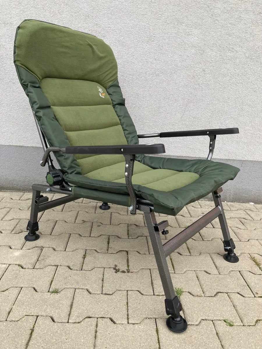 Stabilné, pohodlné a perfektné spracované. Kreslo FK6 má polohovatelé operadlo chrbta a teleskopické nastavenie nôh. Rám kresla je vyrobený zo silných oceľových trubíc s komaxitovou povrchovou úpravou. Matrac je veľmi pohodlná a má vynikajúcu tepelnú izoláciu. Je vyrobená z pevného nylonu. Farba je klasická rybárska zelená. Model FK6 má naviac oproti všetkým ostatným modelom extra tepelne izolovanú matrac a zosilnené bočné vedenie. Parametre: dĺžka sedacej plochy: 50cm šírka sedacej plochy: 50cm nastaviteľná výška: 40-55cm výška operadla: 70cm hmotnosť: 8,5kg povrchová prava: komaxit max. Nosnosť: 150kg elektrostatika je jeden z najväčších producentov rybárskych kresiel, rybárskych ležadiel a rybárskych vozíkov v Európe!