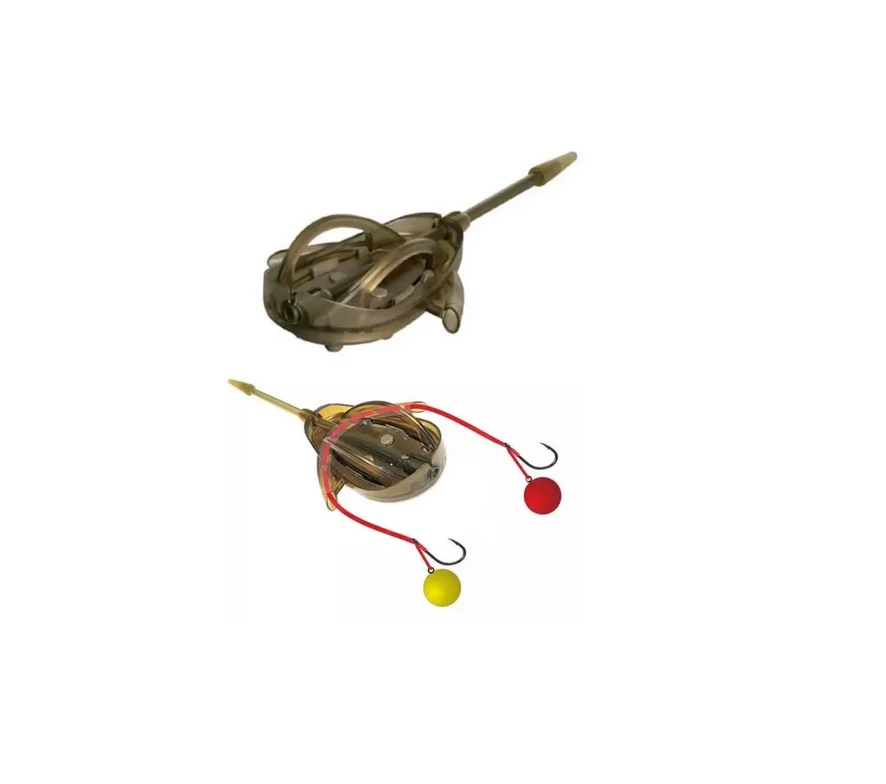 Absolútne jedinečné method kŕmitko, ktoré umožňuje vloženie aj nadväzca s dvomi háčikmi. Stačí len naviazať samostatný nadväzec s dvomi háčikmi a pretiahnuť ho cez špeciálne bočné vývody. Takto budú háčiky smerovať od seba čím sa eliminuje možné ich zamotanie. Zároveň keď zaberie ryba a jeden háčik, tak ťahom zatiahne nadväzec a druhý háčik sa schová do bočného vývodu.