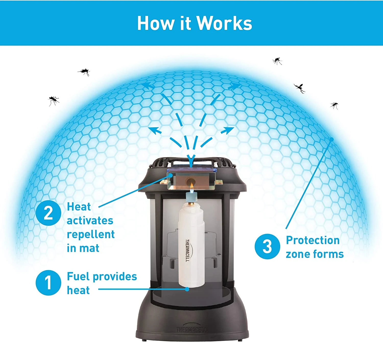 Lampáš PSLL2 predstavuje vodeoodolné kempingové svietidlo s výkonným LED svetlom a ochranou pred komármi a iným nepríjemným hmyzom. Funkcia ochrany pred hmyzom Thermacell je najúčinnejšia ochrana pred bodavým hmyzom, ktorá funguje na princípe postupného uvoľňovania účinnej látky do prostredia a tým dokáže tento prístroj ochrániť až 21m2 priestor. Vankúše s repelentnou účinnou látkou, ktoré sa nachádzajú v hornej časti, sú zohrievané špeciálnymi butánovými náplňami, ktoré následne možné zakúpiť samostatne. Ekonomickým riešením je následné dokupovanie náhradných náplní do odpudzovačov na 48 hodín. Zapnutie svetla je nezávislé od zapnutia ochrany pred hmyzom. Lampáš má zabudovanú obruč pre zavesenie a je napájaný s 3ks batérií typu AAA. V balení sa nachádzajú aj 3ks vankúšov s účinnou látkou a jedna butánová náplň pre 12 hodinovú účinnosť.
