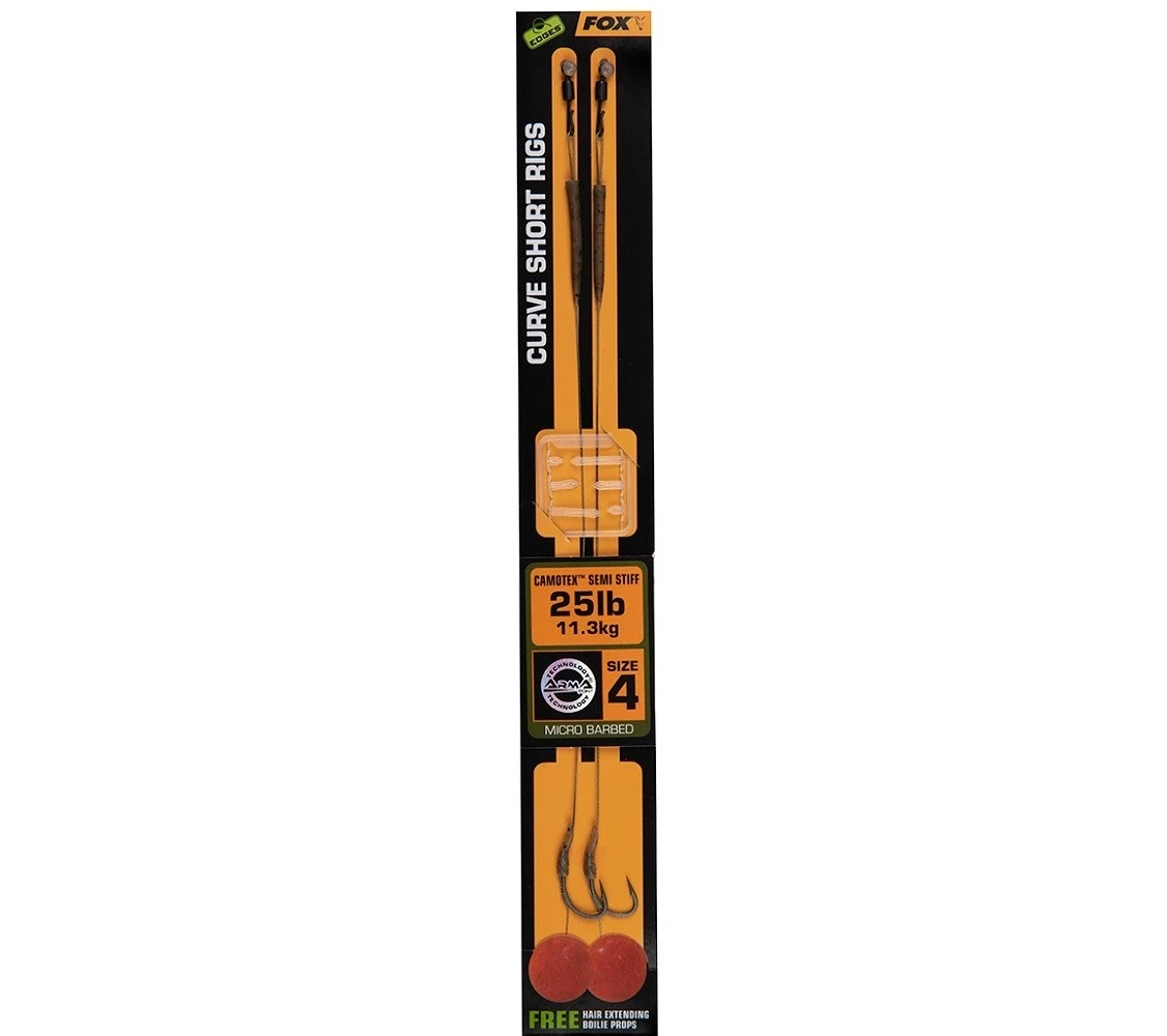 Prvotriedne nadväzce na lov kaprov na boilies a pelety. Kaprárska značka Fox prináša špičkové nadväzce Edges Curve Short Rigs, ktoré sú osadené háčikmi Arma Point Curve Short s rovnátkom Camo Short Line Aligne. Šnúrka bola použitá stužená polotuhá Camotex Semi Stiff Coated s prevlekom a rýchlo výmenných obratlíkom Quick Change. V balení 2ks nadväzcov a predlžovacie zarážky na boilies.