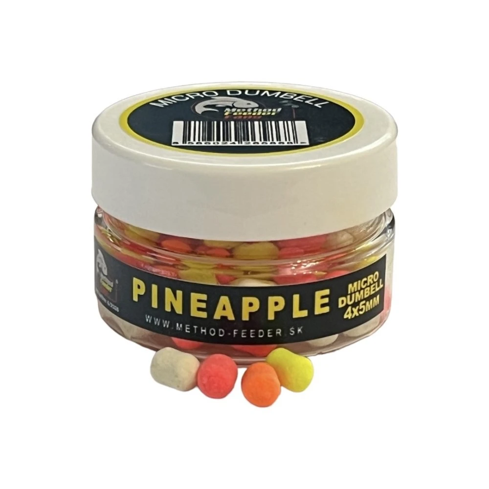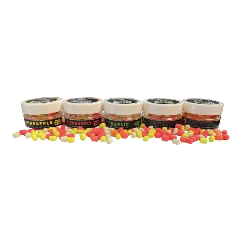 Neodmysliteľnou nástrahou pri love na method feeder alebo jemný lov kaprov je určite malinká výrazná nástraha, ktorá nám najčastejšie prinesie krásny úlovok a zaručí výbornú rybačku. Slovenská značka Method Feeder Fans preto prináša osvedčené Micro Dumbell s mini rozmermi 4x5mm, ktoré sa vyznačujú jemne plávajúcou schopnosťou a teda jemným nadľahčovaním nad dnom a výraznými farbami pričom sú nadipované výraznými esenciami. Ideálne pre jemný lov najmä na jar alebo pri veľmi opatrných záberoch.
