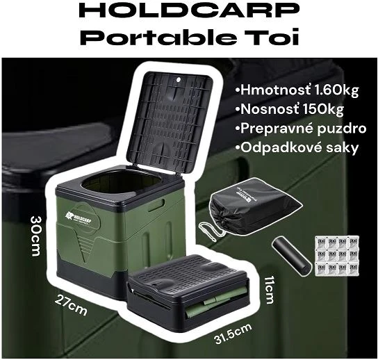 Nový, ľahký, prenosný a praktický, tak by sa dal opísať záchod Portable Toi od značky Holdcarp. Nielen svojou cenou, ale i vybavením valcuje konkurenciu. Výhodou je jeho rýchla príprava. V balení dostanete obal na prevoz, 20 odpadných vriec a 5ks prípravku na stvrdnutie obsahu vreca.