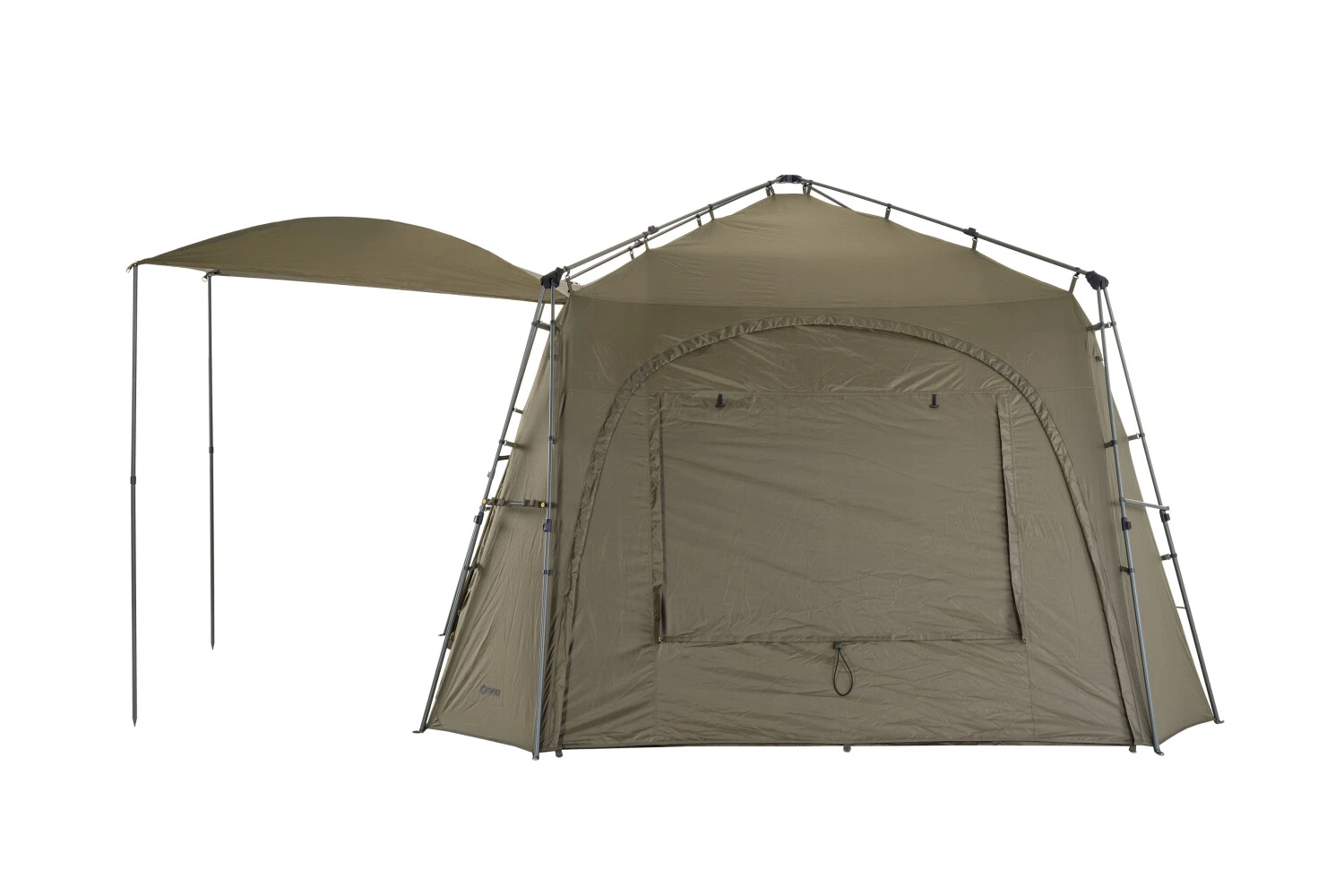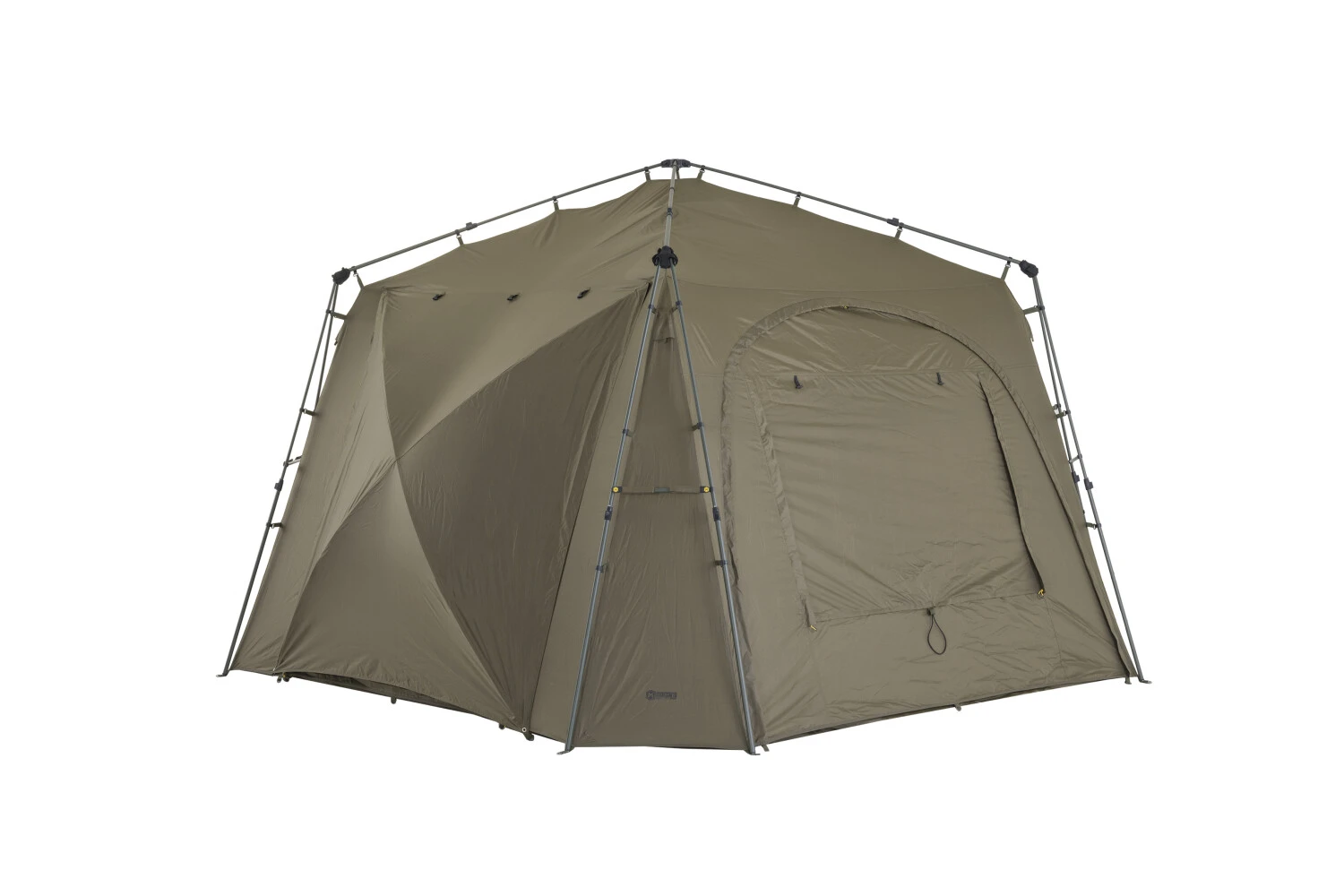 Obrovský rybársky tábor alebo rybársky kemp, ktorý vám výrazne zlepší pobyt pri vode a viac si vychutnáte svoje rybárske výpravy. Prístrešok Base Camp XXL okrem obrovského množstva vnútorného priestoru poskytuje mimoriadnu stabilitu do každého počasia. Práve výbornú stabilitu zaručuje osvedčená konštrukcia s dvojitými tyčkami v rohoch, ktoré sú ešte priečne spevnené malými tyčkami pričom v prednej časti disponujú tieto malé tyčky aj úchytmi na prúty. Hlavná časť konštrukcie obsahuje teleskopické tyče s mechanizmom pre zachytenie a fixáciu. Tento mechanizmus spolu s hlavnými tyčami vytvárajú veľmi kompaktné transportné rozmery a hlavne uľahčujú rozkladanie a skladanie. Všetky tyčky sú natiahnuté v samotnom materiály a preto je rozkladanie len otázkou chvíle a dokáže to aj jeden človek.