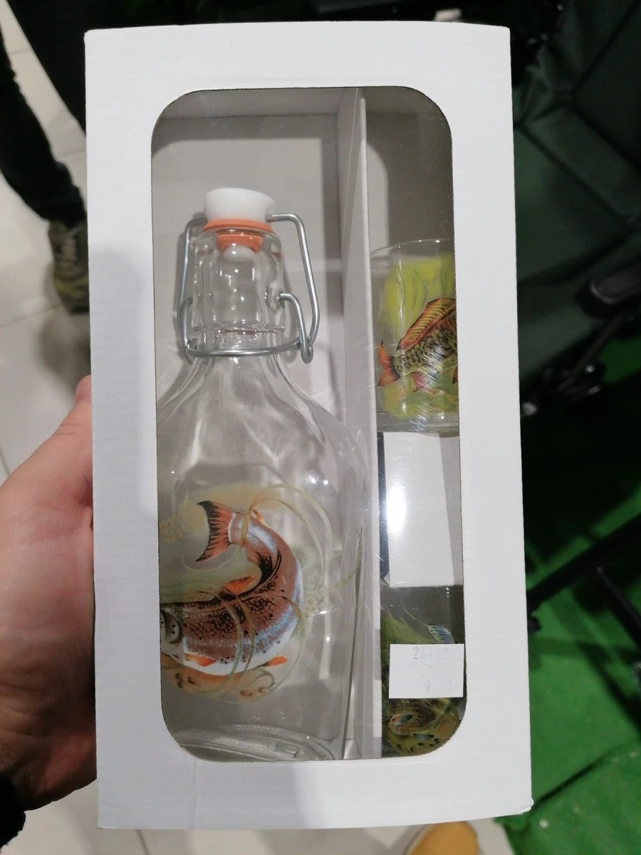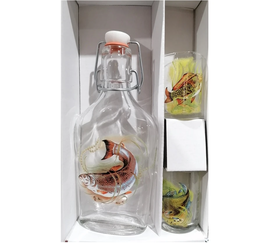 Pekná a praktická flaška s rybárskym motívom spolu s dvomi pohárikmi taktiež s rybárskym motívom.