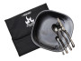 Každý správny rybár si určite na každej výprave dopraje poriadne jedlo, ktoré si pripraví a vychutná priamo na brehu vody. Neoceniteľný doplnok na vychutnanie takéhoto jedla je táto štýlová sada taniera a príborov Blackfire Dinning Set. Sada príborov je vyrobená z nerezovej ocele obsahuje nôž, vidličku, lyžicu a čajovú lyžičku. Tanier je vyrobený z odolného plastu so špeciálnou povrchovou úpravou a dizajnom Blackfire. Dodáva sa v praktickom prepravnom puzdre. Sada je tak celkovo veľmi odolná, má štýlovú povrchovú úpravu Blackfire a laserom leptané detaily.