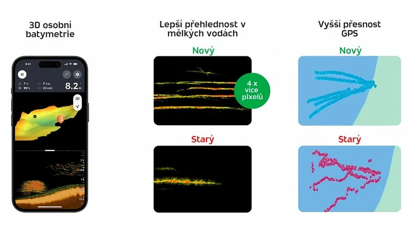 Deeper Chirp+ 3 ponúka funkcie, ktoré by ste našli aj v klasických sonaroch, akurát sú zabalené v kompaktnej konštrukcii. Hovoríme napríklad o možnosti rozpoznania rýb už 15 cm pod hladinou, či o 3 frekvenciách lúčov, ktoré umožňujú skúmanie vody pod viacerými uhlami či rozpoznanie objektov už od 1cm. Na ovládanie slúži aj v tomto prípade voľne stiahnuteľná aplikácia Fish Deeper, v ktorej môžete sledovať, analyzovať a ukladať svoje pozorovania. Rovnako v nej môžete pristupovať k službe BATHYMETRY s batymetrickými mapami (v cene zariadenia 3 mesiace služby zadarmo), ktorá vám ukáže podvodné mapy vodných plôch po celom svete.