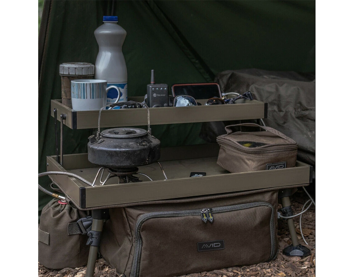 Ak aj vy patríte medzi rybárov, ktorí chodia na viacdňové výpravy a poriadok v bivaku je pre vás prioritou, tak ste práve našli produkt, ktorý si obľúbite. Stolík Avid Carp Double Decker Bivvy Organiser je totižto kombináciou toho, čo v bivaku potrebujete - úložného miesta, plochy na varenie a odkladacieho priestoru na vašu rybársku výbavu.