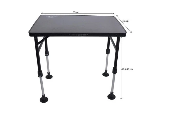 Pevný a odolný stolík do bivaku s teleskopickými nohami a rozmermi vrchnej dosky až 65 x 45cm. Nohy je možné vyzdvuhnúť až do výšky 60cm. Na prenos je pripevnené špciálne madlo na prednej strane stolíka. Celá konštrukcia je z ľahkých hliníkových dielov a preto je celková váha stolíka len 2,95kg.