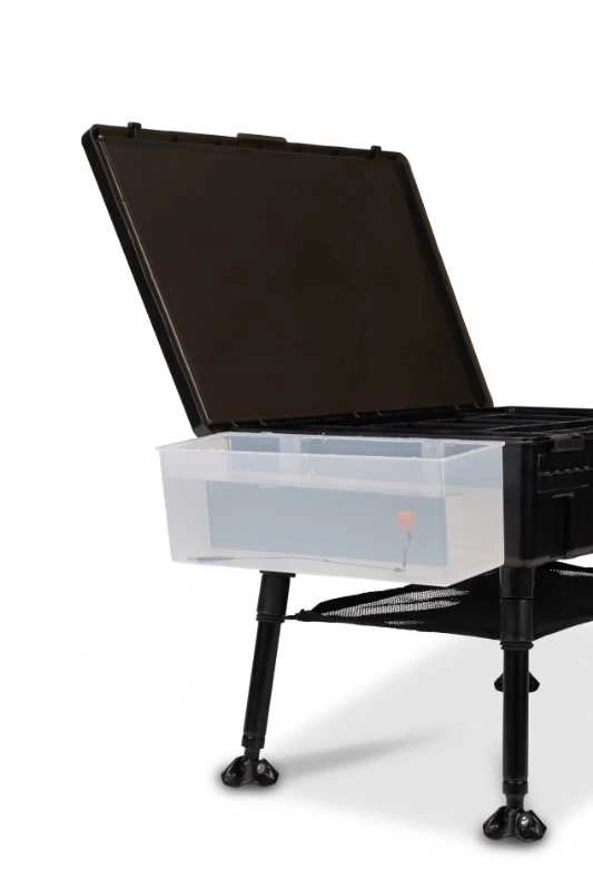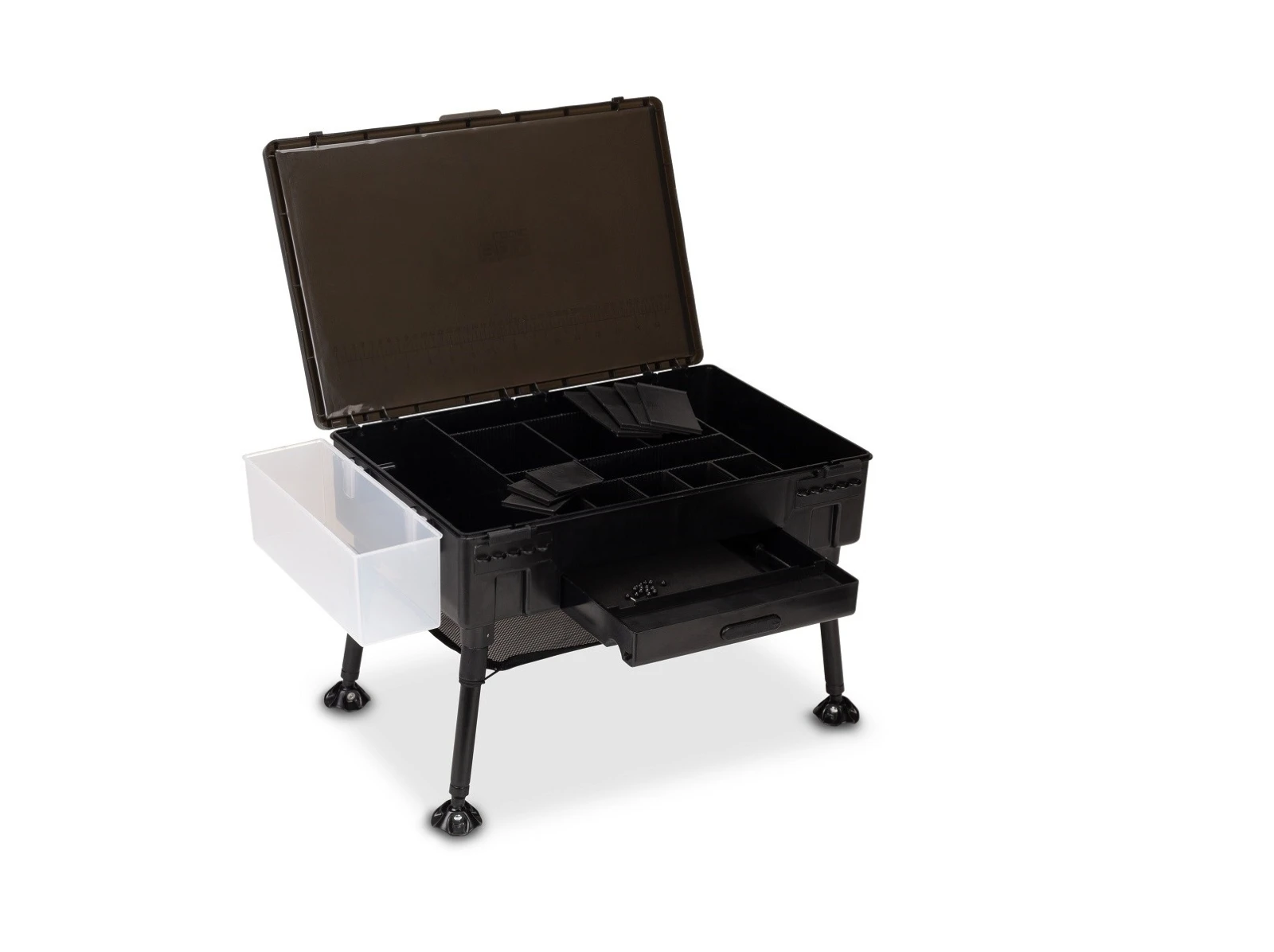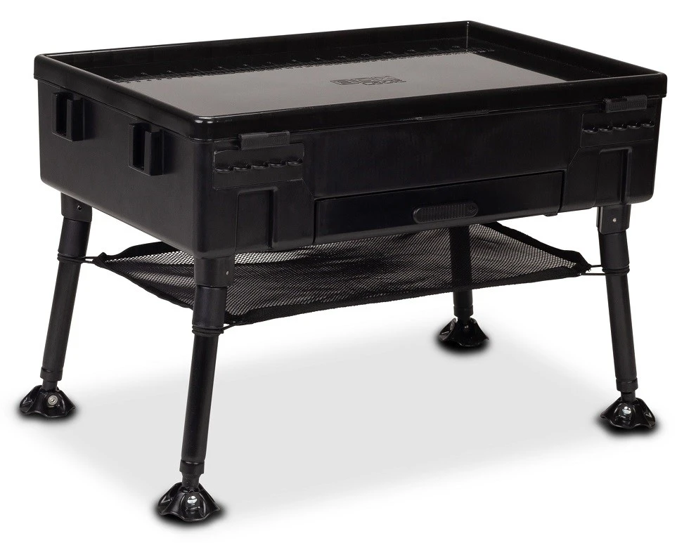 Štyri teleskopické nohy stola sa dajú zložiť pri prenose a sú výškovo nastaviteľné od 33 do 39 cm. Stolík si tak jednoducho môžete umiestniť kdekoľvek do bivaku, pričom ho vďaka hornému uzatvárateľnému veku s okrajom môžete použiť aj na prípravu jedla alebo odloženie vecí v čase, kedy nepotrebujete viazať nové montáže. Bočné konzoly umožňujú k stolíku prikúpiť dodatočné úložné boxy, odkladacie plochy alebo nádobku na testovanie práve zhotovených montáží.