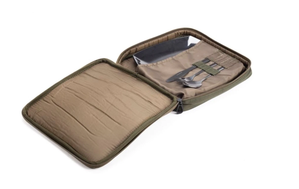 Jednoduchá no nevyhnutná záležitosť na dlhšie rybačky. Prestížna kaprárska značka Nash prináša kaprárom jedálenskú sadu pre jednu osobu, ktorá obsahuje čierny žiaruvzdorný tanier, nôž, vidličku a lyžičku. Na spodnej strane je taktiež praktické vrecko na umiestnenie sáčikov s koreninami prípadne soľou. Všetko je to umiestnené v praktickej taške, ktorá nezaberá veľa miesta a viete ju uložiť prakticky kamkoľvek. Rozmery ťašky sú 29x29x4cm.