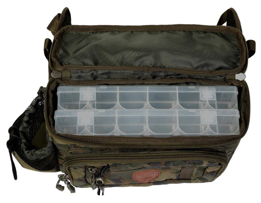 Ideálna taška pre každého prívlačiara! Praktická taška, ktorú je možné nosiť ako ladvinku na páse vďaka polstrovanej zadnej strane tašky. Súčasťou tašky je aj praktické cvakátko, ktoré je pripevnené priamo na taške. V taške nájdete aj dva veľké boxy na na nástrahy s rozmermi 27x18cm. Na boku tašky je aj priestor pre fľašku s vodou. Taška je vyrobená z odolného vodeodolného materiálu s kovovými zipsami. Celkové rozmery sú 28x12x20cm.