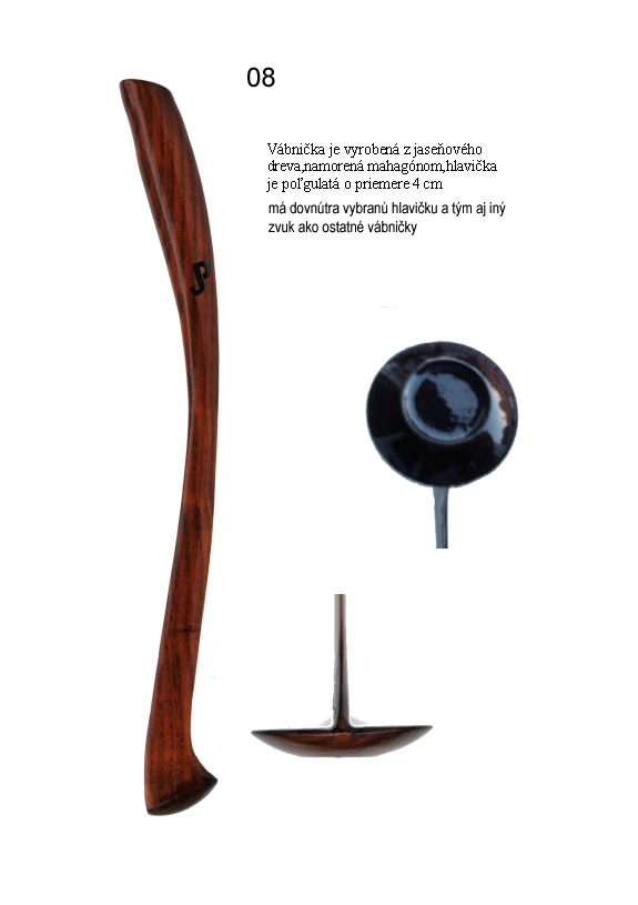 Vábnička je vyrobená z jjaseňového dreva namoreného mahagónom, hlavička je poľgulatá s priemerom 4cm. Má dovnútra vybranú hlavičku a tým má unikátny zvuk, ktorý nemá žiadna iná vábnička!