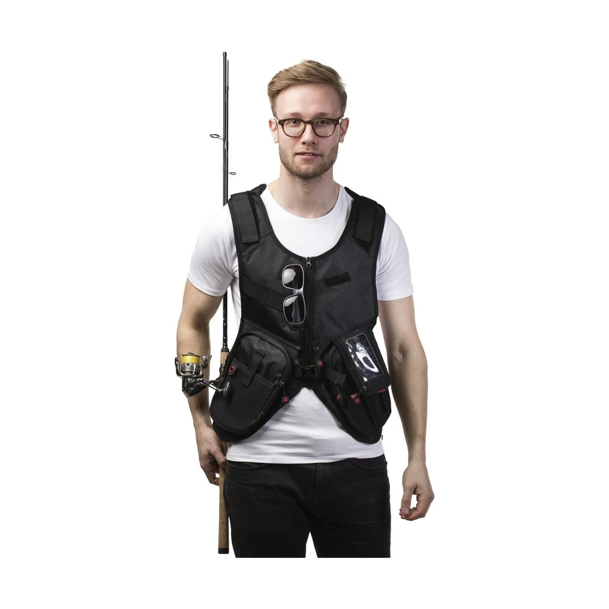 Prvky pre uchytenie rybárskeho prútu po oboch stranách vesty.
